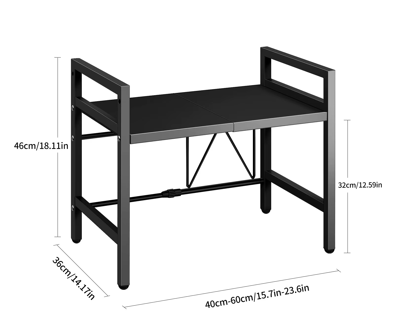 Cette étagère est conçue pour optimiser la place et l'organisation de votre plan de travail, grâce a son design extensible en largeur ! Sa finition en acier noir se glisse dans tous les styles de cuisine. Le plateau supérieur peut être surélevé d'un cran pour s'adapter à tous les four à micro-ondes. Il est aussi équipé de crochet pour vos ustensiles.