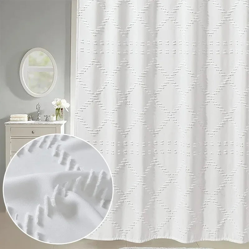 Rideau de douche blanc au design épuré, idéal pour une salle de bain propre et lumineuse.